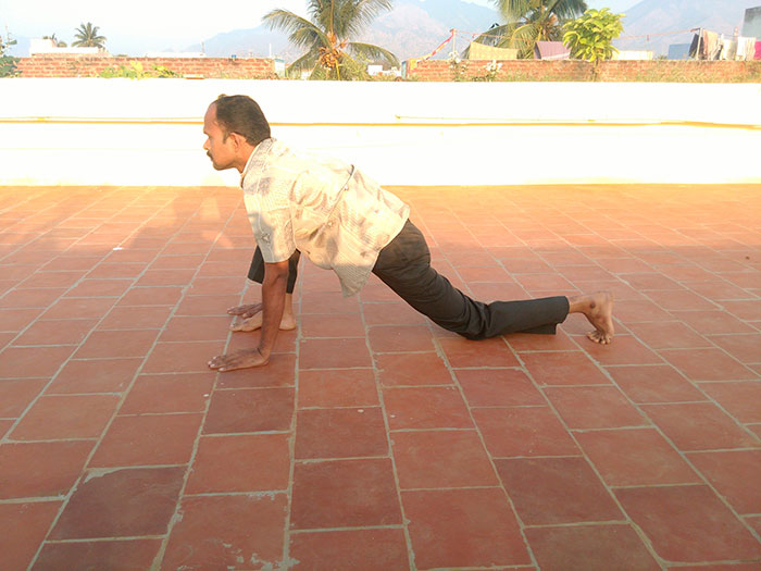 - கைகளை ஊன்றி தலையை மெதுவாக மேலே மெதுவாகத் தூக்கி மேல்நோக்கி பார்வையினைச் செலுத்தவும்.