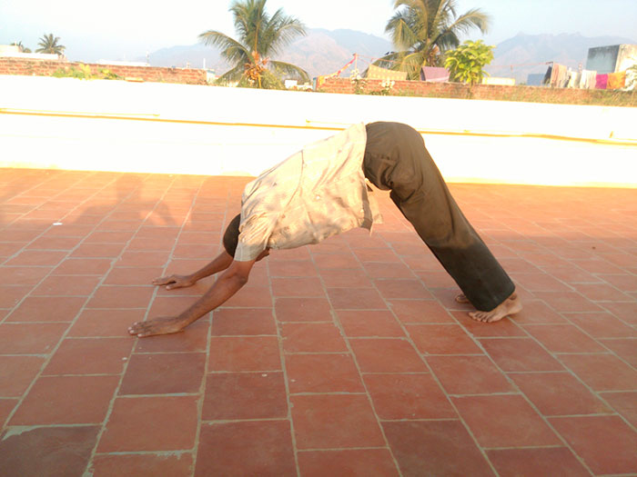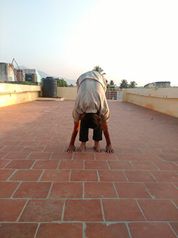 - முழங்கால்களை வளையாமல் நேராக வைத்திருந்து இடுப்பை மாத்திரம் முன்பக்கமாக சிறிது சிறிதாக வளைத்து உள்ளங்கை விரல்கள் தரையில் தொடவேண்டும். கால்விரல்களும், கைவிரல்களும் ஒரே வரிசையில் இருக்கவேண்டும்.
