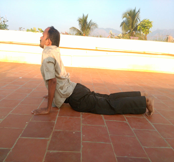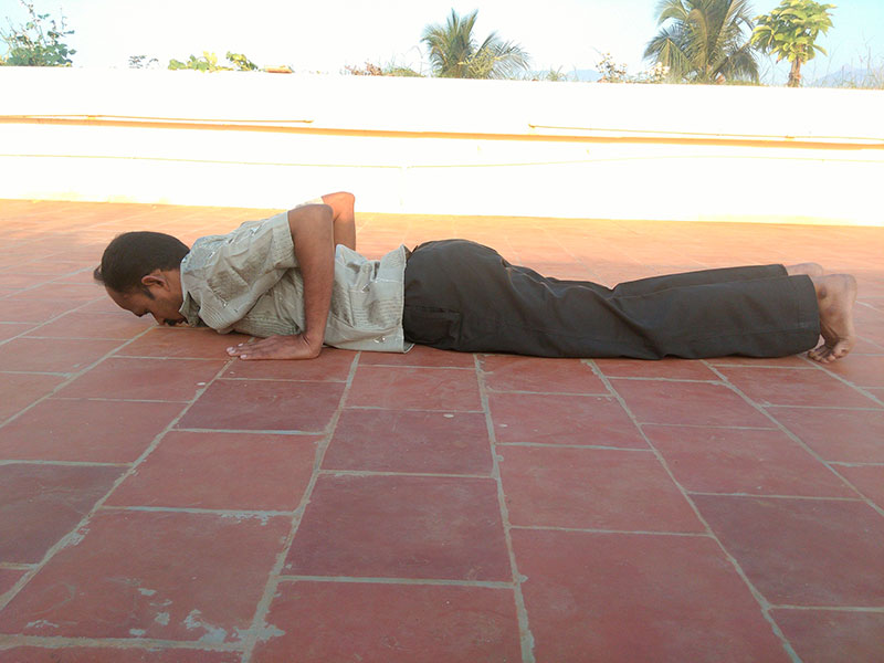 - நெற்றி, நெஞ்சு, முழங்கால்கள் லேசாக தரையில் படும்படியாக தரையில் படுக்கும் நிலை. இது சூரிய பகவானுக்கு சாஷ்டாங்க நமஸ்காரம். இதில் கைகள் இரண்டும் வலி எடுக்கும். சிறிது சிறிதாக இந்நிலையை சரிப்படுத்த வேண்டும். தரையில் பிறப்புறுப்பு படாவண்ணம் படுத்திருத்தல் அவசியம்.