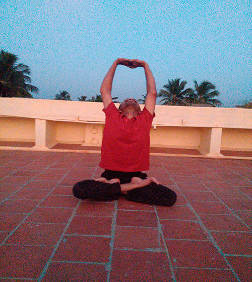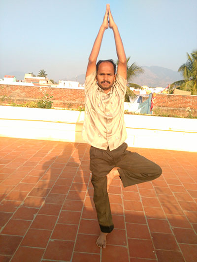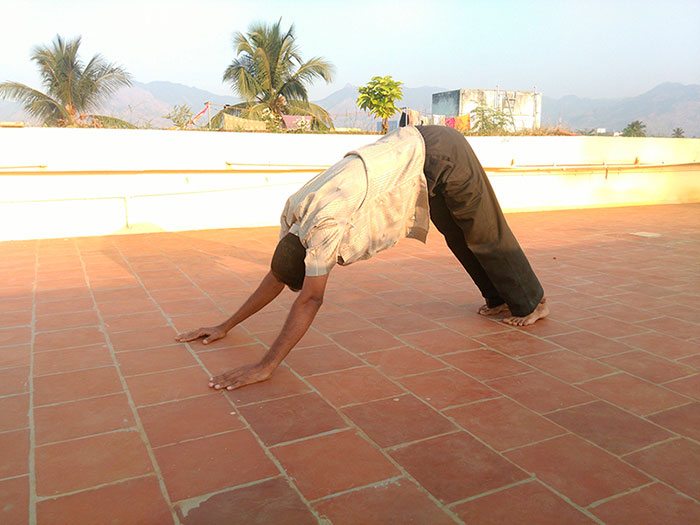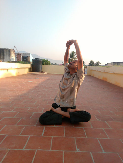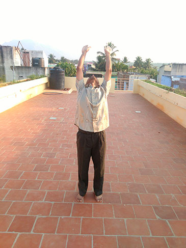 - கைகளை, காதுகள் ஓரமாக உயா்த்தி இடுப்பை மட்டும் பின்பக்கம் முடிந்தவரை சிறிது வளைத்து நில்லுங்கள்.