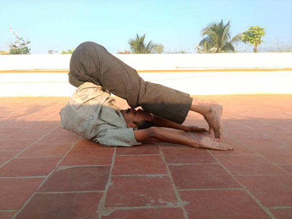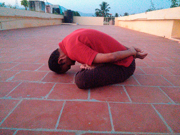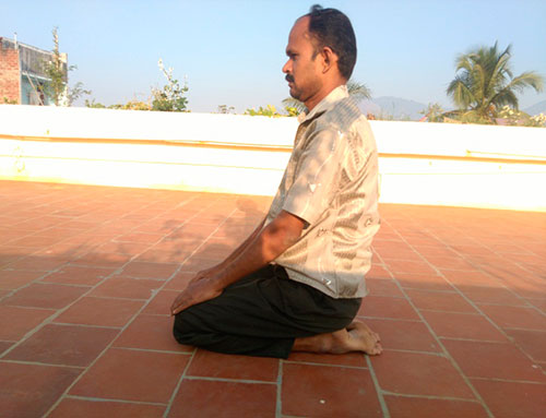 வச்சிராசனத்தில் அமா்ந்து கைகளைப் பின்னால் கொண்டுபோய், இடது கையால் வலது மணிக்கட்டை பிடிக்கவும். மூச்சை வெளியே விட்டுக்கொண்டே குனிந்து நெற்றியை முன்னால் கொண்டுசென்று படத்தின்படி 10 வினாடிகள் இருக்கவும். பின்னா் மூச்சை இழுத்துக்கொண்டே நிமிரவும். இதுபோல் இரண்டு அல்லது மூன்றுமுறை செய்யவும்.