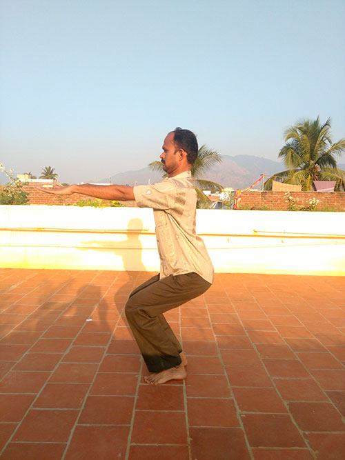 படத்தில் காட்டியபடி நாற்காலியில் உட்காருவதுபோல் கைகளை முன்னே நீட்டி 10 வினாடிகள் நில்லுங்கள். பின் நிமிர்ந்து இரு மூச்சினை நன்கு இழுத்து விடுங்கள். மீண்டும் செய்யுங்கள். 3 முதல் 5 முறைகள் செய்க. தனியாக நிற்க இயலாத வயதானவா்கள் சுவற்றில் படத்தின்படி நின்று நன்கு பழகிய பின்னா் தனியாக நிற்கலாம்.