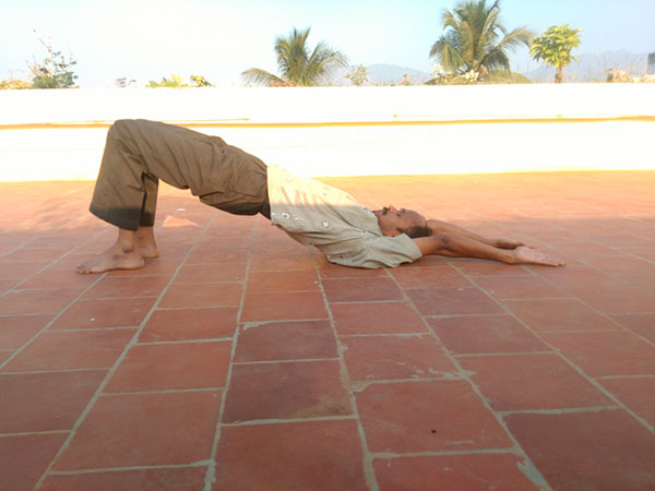 மல்லாந்து படுக்கவும். இரு கால்களையும் படத்தில் உள்ளபடி முழங்கால் அளவு மடக்கி, கைகளை தலைக்குப் பின்னால் நீட்டவும். மூச்சை இழுத்து நிறுத்தி, மார்பு, இடுப்பு பகுதிகளை நன்றாக படத்தில் உள்ளதுபோல் தூக்கவும். இப்போது சாதாரண நிலையில் சுவாசம் செய்யவும். 20 எண்ணும் வரை இருந்து கால்களை கீழே போடும்போது மூச்சை இழுத்து நிறுத்தி கால்களை நீட்டவும். ஓய்வு எடுத்த பின்னா் அடுத்த முறை செய்யவும். இவ்வாறு 3 முதல் 5 தடவைகள் செய்யலாம்.