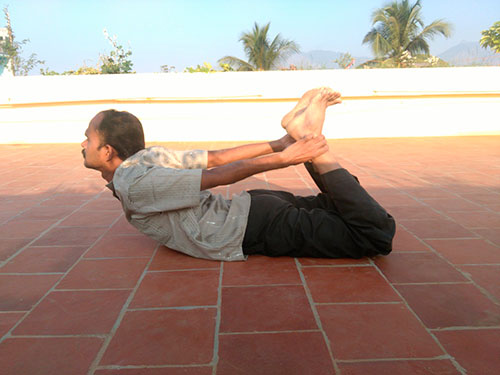 படத்தின்படி குப்புறப்படுத்தபடி இரு கால்களை மெல்ல மடக்கி மூச்சை வெளியே விட்டபடியே இருகைகளை பின்புறமாக வீசி, கணுக்கால்களை கெட்டியாகப் பிடிக்கவும். இதுபோல் 10 வினாடிகள் வரை இருந்து, பிறகு சுவாசித்தவாறு மெல்ல தரையில் படுக்கவும். இதுபோல் 5 தடவைகள் செய்யவும். இதில் நன்றாக தோ்ச்சி பெற்றபிறகு தலை, கழுத்து, மார்பு, தொடைகள் பூமியில் படாதவாறு முன்னாலும், பின்னாலும் ஆடவும்.