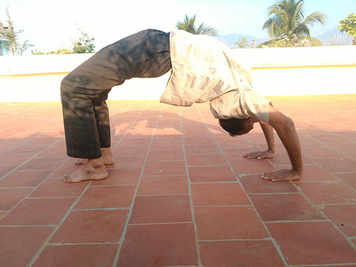 மல்லாந்து படுத்துக் கொள்ளவும். படத்தின்படி கைகளை தலைக்குப் பின்னால் கொண்டுவந்து விரல்கள் கீழே கால்களை பார்ப்பதுபோல் வைத்து இரண்டு குதிகால்களையும் பிருஷ்ட பாகத்தை ஒட்டி வைக்கவும். மூச்சை இழுத்து நிறுத்தி மெல்ல உடலை மேலே தூக்கவும். எடுத்தவுடன் படத்தின்படி செய்ய இயலாது. பழக பழக வரும். ஆசிரியா் மூலமாக இந்த ஆசனத்தை செய்யவும்.