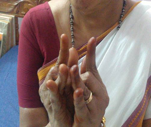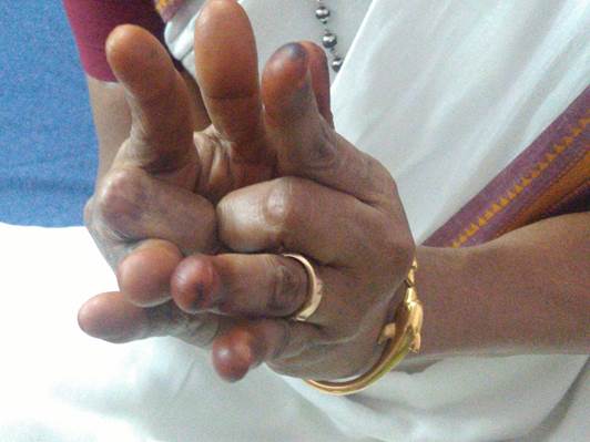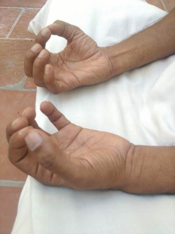 பெருவிரல், சுட்டுவிரல், நடுவிரல் மூன்றின் நுனிகளும் ஒன்றையொன்று அதிக அழுத்தம் இல்லாமல் தொடவும். மோதிரவிரலை மடித்து உள்ளங்கையின் நடுவில் உள்ள பள்ளத்தை தொடவும். சிறுவிரல் நேராக வைக்கவும்.
