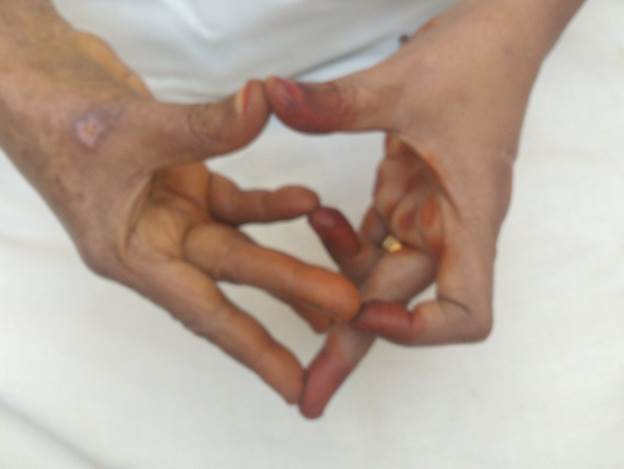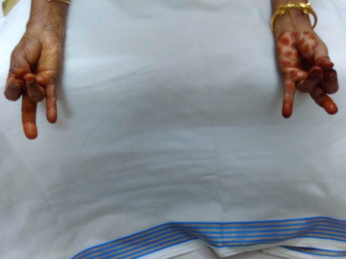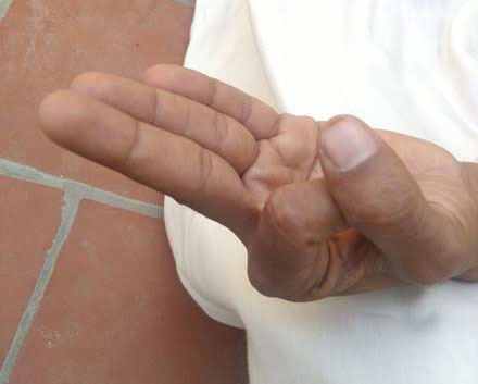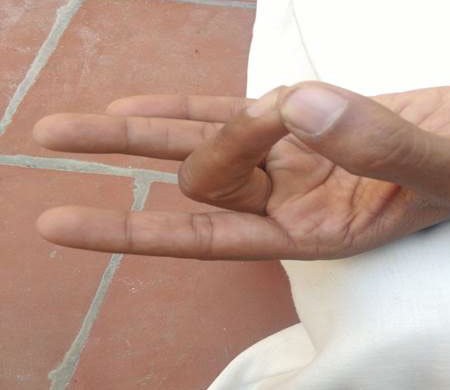 - பெருவிரல் நுனியை சுண்டுவிரல் மற்றும் மோதிர விரல் நுனிகளை தொடுமாறு வைக்கவும். மற்ற இரு விரல்களான ஆள்காட்டி விரலும் நடுவிரலும் நேராக இருக்கவேண்டும்.