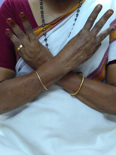 முதலில் சுண்டுவிரலை மடக்கி அதன்மீது கட்டைவிரலை வைத்து சிறிதளவு அழுத்தம் கொடுக்கவும். மோதிரவிரல், நடுவிரல், ஆள்காட்டிவிரல் ஆகியவை நேராக இருக்க வேண்டும் ஒன்றைஒன்று தொடாமல் சிறிது இடைவெளி விட்டு ஒரு சூலத்தை போல் நேராக நிற்க செய்யவும்.