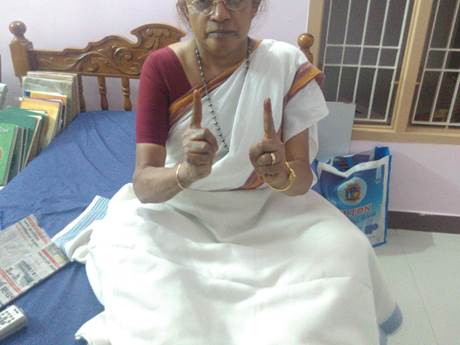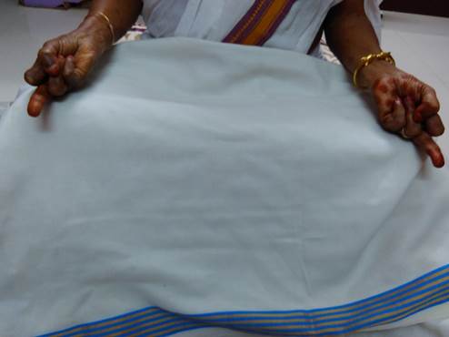 சுட்டு விரலை மடித்து பெருவிரலின் அடிப்பாகத்தை தொடவும். நடுவிரல், மோதிர விரல்களை மடித்து பெருவிரலின் நுனிப் பகுதியை தொடவும். சுண்டுவிரல் நேராக வைக்கவும்.