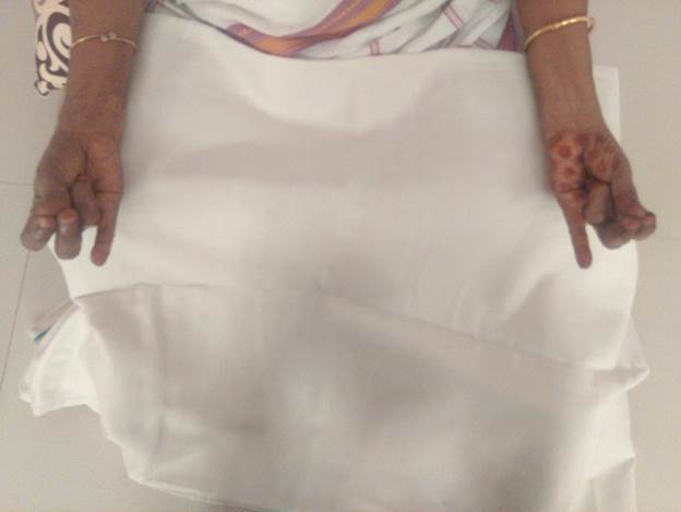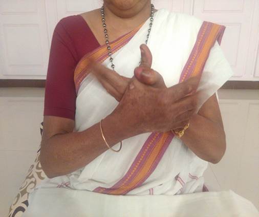 இரண்டு கைகளையும் இறுக மடக்கவும். நான்கு விரல்களும் இறுக்கமாக மடக்கியிருக்க, பெருவிரல் நடுவிரல் மேல் இறுக்கமாக நெஞ்சிக்கு அருகில் வைக்கவும். மூச்சை மெதுவாக இழுத்து விட்டு இரு கைகளைலும் சுட்டு விரலை மேல் நோக்கி வைக்கவும்.